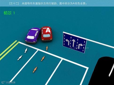 32、未按导向车道指示方向行驶的,图中所示为A车负全责。