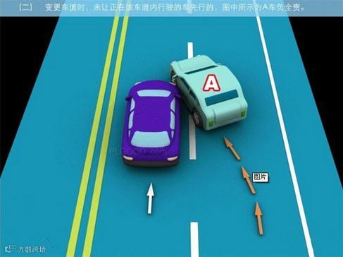 2、变更车道时,未让正在该车道内行驶的车先行的,图中所示为A车负全责。