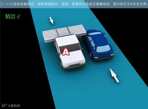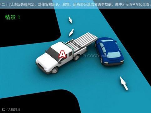 29-2违反装载规定,致使货物超长、超宽、超高部分造成交通事故的,图中所示为A车负全责。