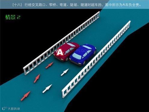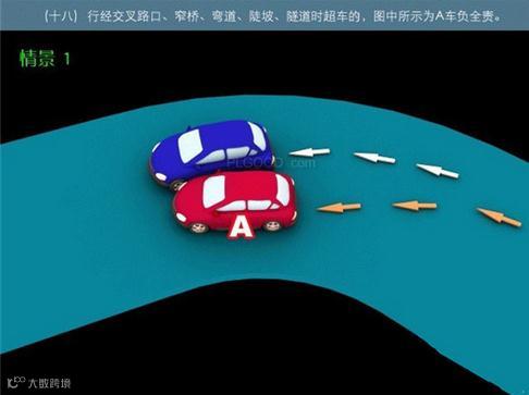 18-2、行径交叉路口、窄桥、弯道、陡坡、隧道时超车的,图中所示为A车负全责。