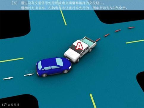 5、通过没有交通信号灯控制或者交通警察指挥的交叉路口时,遇相对方向来车,左转弯车未让直行车先行的,图中所示为A车负全责。