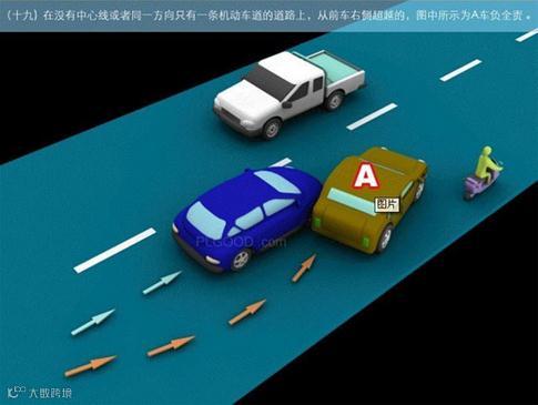 19、在没有中心线或者同一方向只有一条机动车道的道路上,从前车右侧超越的,图中所示为A车负全责。