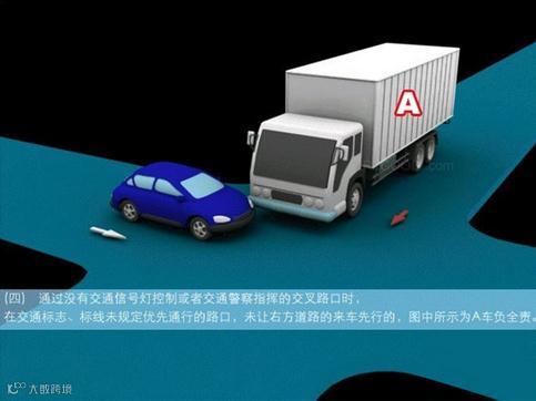 4、通过没有交通信号灯控制或者交通警察指挥的交叉路口时,在交通标志标线规定优先通行的路口,未让右方道路的来车先行的,图中所示为A车负全责。