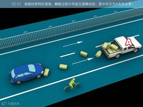 30、装载的货物在遗撒、飘散的过程中导致交通事故的,图中所示为A车负全责。