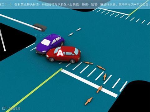 21、在有禁止掉头标志、标线的地方以及在人行横道、桥梁、陡坡、隧道掉头的,图中所示为A车负全责。
