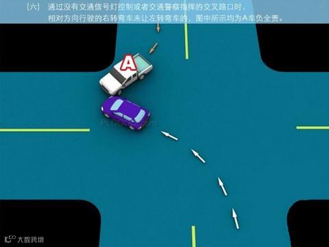 6、通过没有交通信号灯控制或者交通警察指挥的交叉路口时,相对方向行驶的右转弯车未让左转弯车的,图中所示为A车负全责。