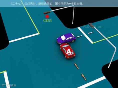 27.红灯亮时,继续通行的,图中所示为A车负全责。