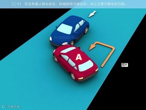 20、在没有禁止掉头标志、标线的地方掉头时,未让正常行驶车先行的,图中所示为A车负全责。