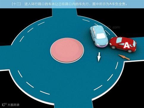 12、进入环形路口的车未让已在路口内的车先行,图中所示为A车负全责。