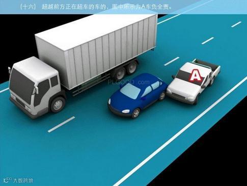 超越前方正在超车的车的,图中所示为A车负全责。