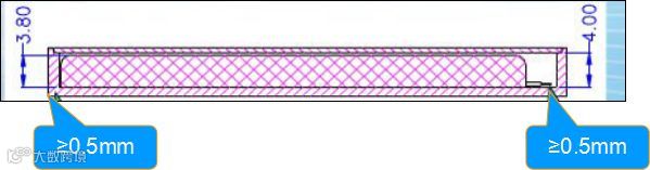 由于电芯的自身结构较为特殊,因此设计或使用时必须注意:必需充分考虑电芯的装配空间,使电芯装配后不能受挤压。注意外壳内空、电芯厚度、充电膨胀厚度等尺寸1)电池外壳内腔必须平整,无毛刺;2)电池外壳胡内腔长度:保证电芯装配后前后有0.5mm以上的空间。3)电池外壳的内腔长度:保证电芯装配后两侧有0.5mm以上的空间。4)电池的内腔高度:除去电芯的厚度+双面胶的厚度,有>0.2mm的空间如下图所示