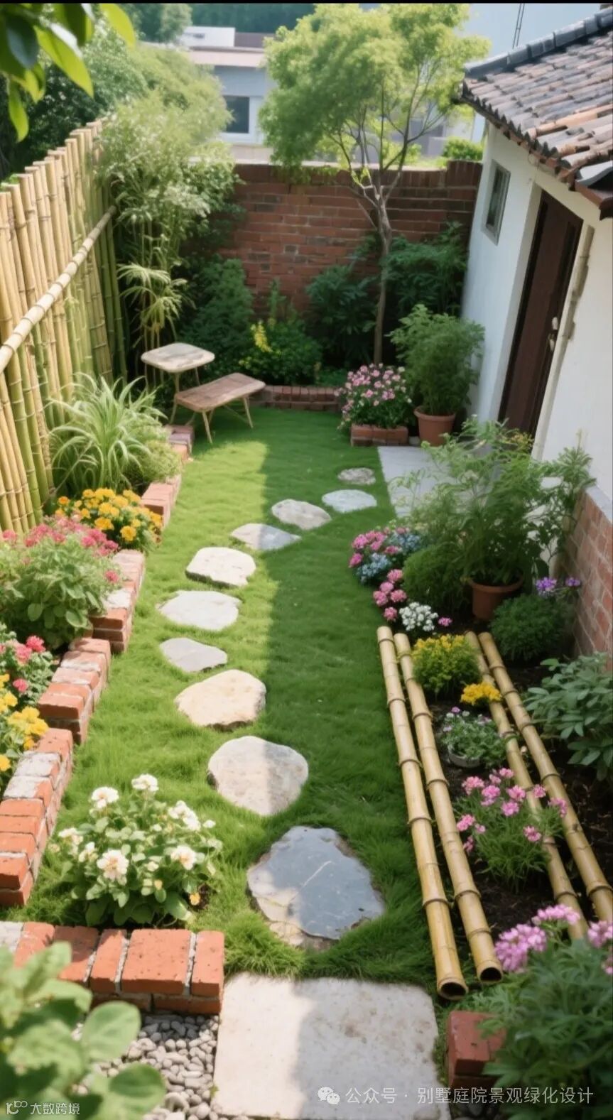 - 步道:砾石+鹅卵石(5–10元/块)或旧砖铺设。