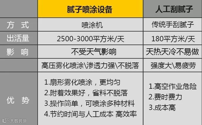 腻子喷涂机效率高达每小时150---200平米,日均喷涂面积2000平方米左右,一台设备相当于10-15个手工工人的生产力(根据操作人员的熟练程度),大大降低了人力成本开支。
