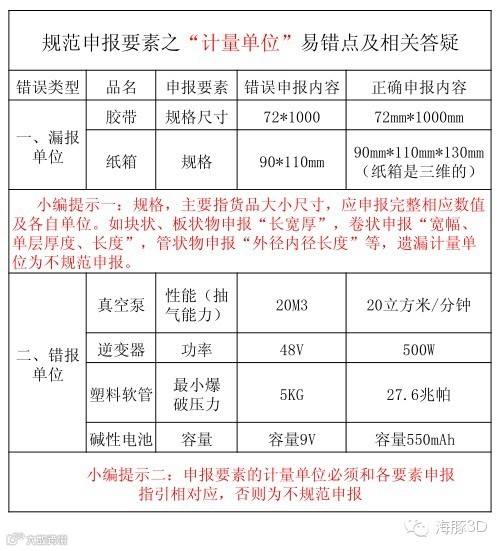 报关过程中,规格尺寸、功率、容量等申报要素是需要报清相应计量单位的。小编为您总结了报关中计量单位的常见易错点,详见下表: