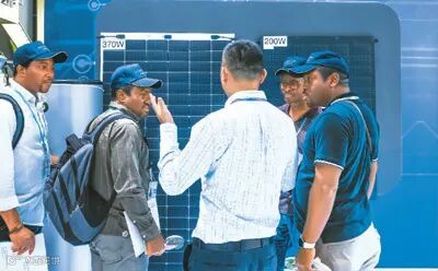 图为参展商在第135届广交会上向非洲采购商介绍太阳能电池组件展品。