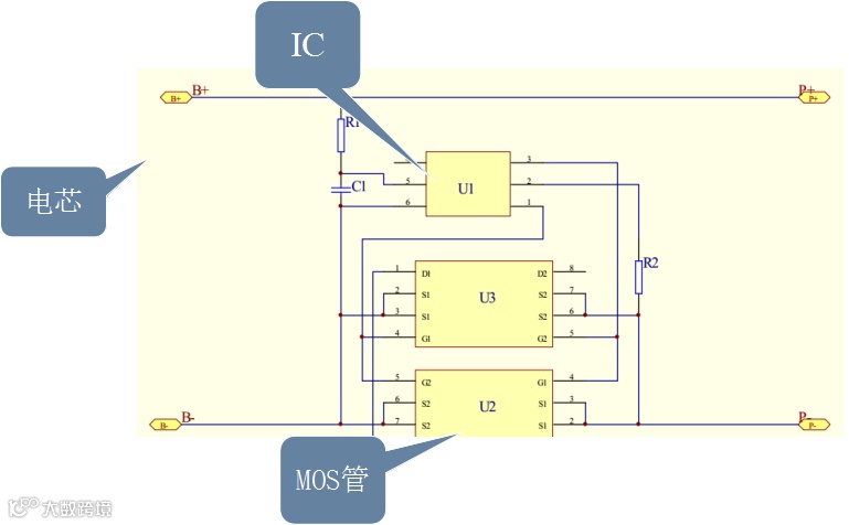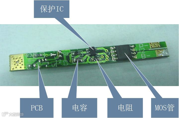 保护板通常包括控制IC、MOS开关及辅助器件NTC、ID存储器等。其中控制IC,在一切正常的情况下控制MOS开关导通,使电芯与外电路沟通,而当电芯电压或回路电流超过规定值时,它立刻控制MOS开关关断,保护电芯的安全。