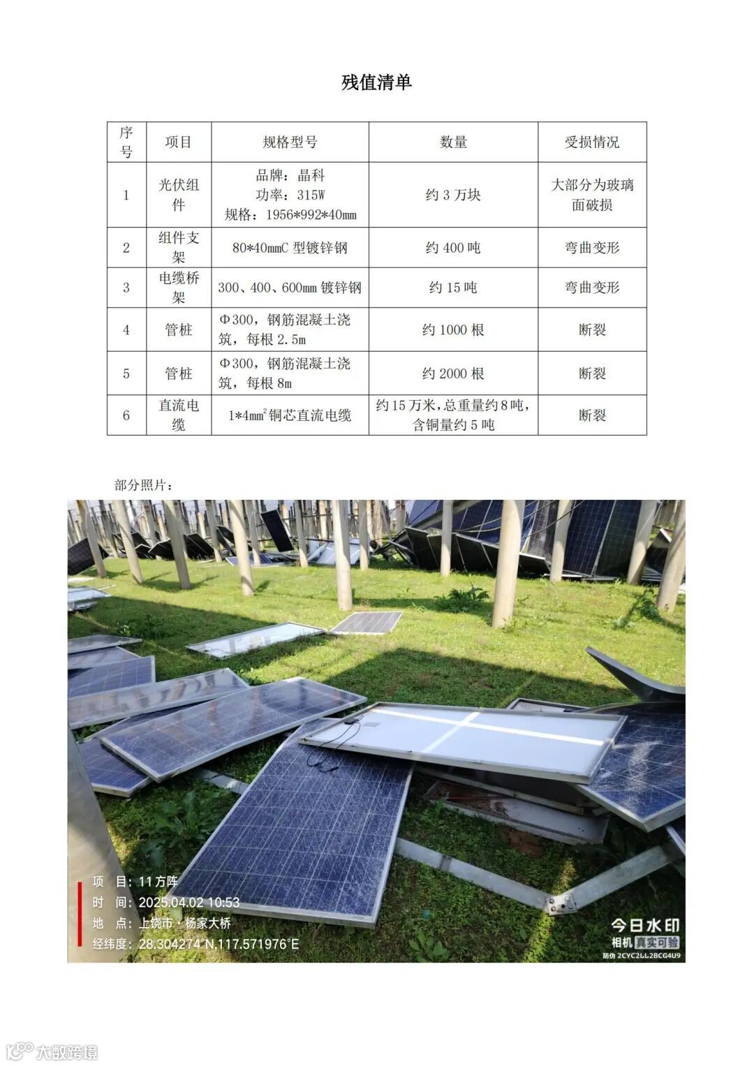 标的规格: 组件:315W,支架为C型钢,直流及交流电缆