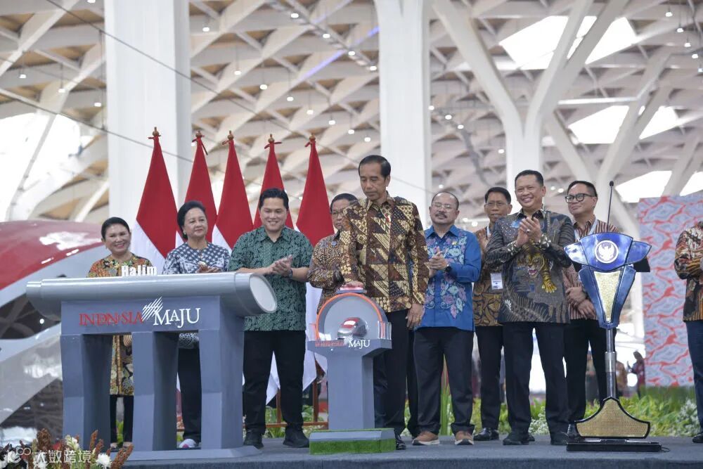 10月2日,在印度尼西亚雅加达哈利姆高铁站,印尼总统佐科(前)在雅万高铁启用仪式上按下启用键。新华社记者徐钦摄