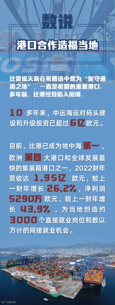 比雷埃夫斯在希腊语中意为“扼守通道之地”,一直是希腊的重要港口。多年前,比港经营陷入困境。中国远洋海运集团(中远海运)2008年与希腊方面签署特许经营权协议,2010年接管比港二号、三号集装箱码头,2016年收购比港港务局67%股权并接手港务局经营。十多年来,中远海运对码头建设和升级投资已超过6亿欧元。如今比港已成为地中海第一、欧洲第四大港口和全球发展最快的集装箱港口之一,2022财年营收达1.95亿欧元,较上一财年增长26.2%,净利润5290万欧元,较上一财年增长43.9%,为当地创造约3000个直接就业岗位和数以万计的间接就业机会。