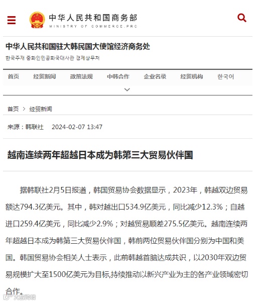 据韩联社2月5日报道,韩国贸易协会数据显示,2023年,韩越双边贸易额达794.3亿美元。其中,韩对越出口534.9亿美元,同比减少12.3%;自越进口259.4亿美元,同比减少2.9%;对越贸易顺差275.5亿美元。越南连续两年超越日本成为韩第三大贸易伙伴国,韩前两位贸易伙伴国分别为中国和美国。韩国贸易协会相关人士表示,此前韩越首脑达成共识,以2030年双边贸易规模扩大至1500亿美元为目标,持续推动以新兴产业为主的各产业领域密切合作。