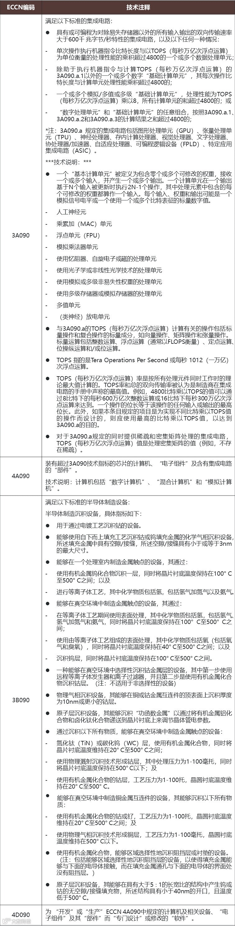 本次EAR修订中新增的四个ECCN编码3A090、4A090、3B090和4D090,分别对应了先进计算芯片、装有先进计算芯片的计算机和相关设备和配套软件,以及特定的半导体制造设备,其具体描述如下: