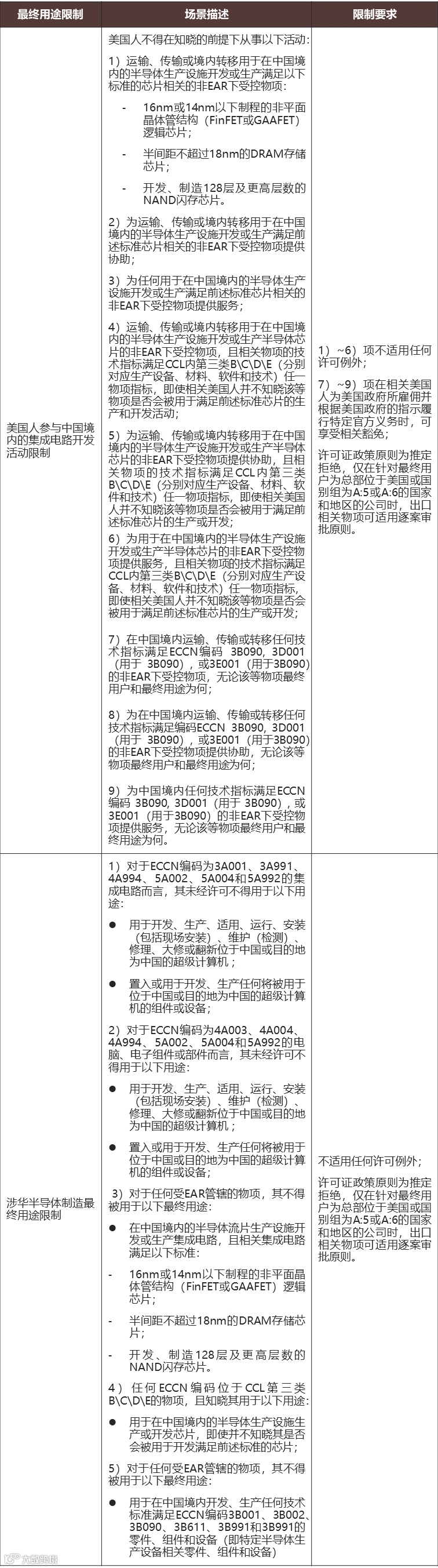 本次EAR修订中,BIS还在EAR第744.6节下增设了(c)小节,并增设了第744.23节,对美国人参与中国境内的集成电路开发活动以及涉及中国的半导体制造最终用途设置了严格限制。相关规则基本内容如下: