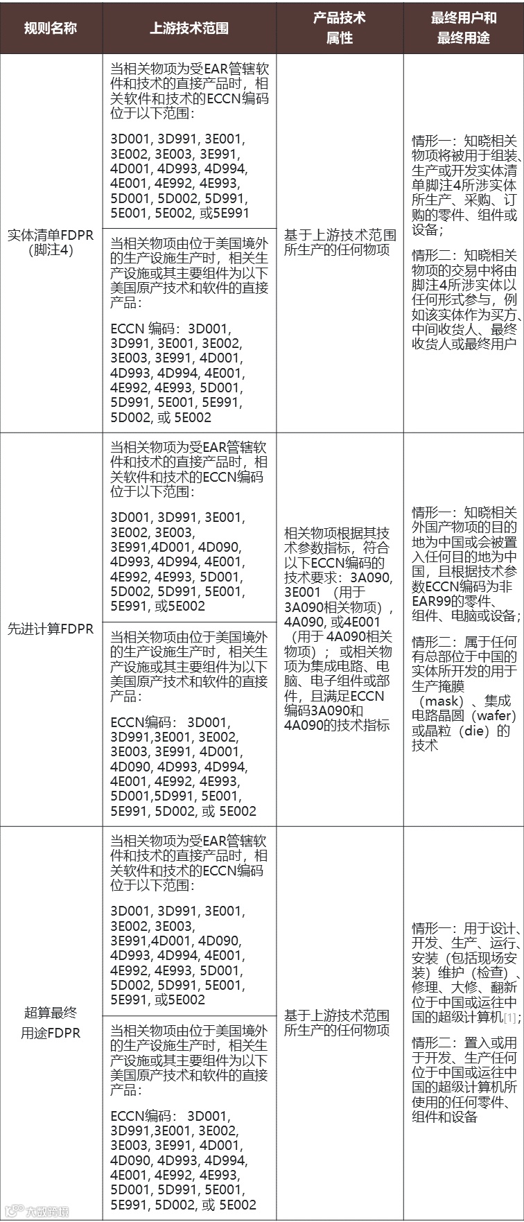 本次新规的另一重磅举措便是三个全新的外国直接产品规则(Foreign Direct Product Rule,“FDPR”)。自2020年5月美国首次在EAR下对FDPR进行修订、引入针对特定实体的FDPR以来,相对于同样可以延伸管制美国境外产物项的最低成分含量规则 (de Minimis rule)而言,美国在近年来的出口管制规则修订中,越来越倾向于使用FDPR以确保对境外物项进行管制的效果,仅在今年上半年美国即连续推出针对俄罗斯为目的地的俄罗斯FDPR和针对俄罗斯特定实体的俄罗斯MEU FDPR。而本次新推出的三个新的FDPR,继续沿用了FDPR关于上游技术、产品技术属性、最终目的地和最终用途的三段式管控逻辑,其具体内容如下: