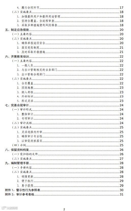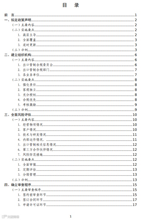 良好的出口管制内部合规制度包括九个基本要素:一是拟定政策声明,二是建立组织机构,三是全面风险评估,四是确立审查程序,五是制定应急措施,六是开展教育培训,七是完善合规审计,八是保留档案资料,九是编制管理手册。本指南围绕以上九个要素对出口经营者建立健全出口管制内部合规制度提供一般性指引,出口经营者(包括高校、科研院所等相关单位)可参考指南内容,根据本单位业务特点和实际情况,建立和完善符合自身实际的出口管制内部合规制度。