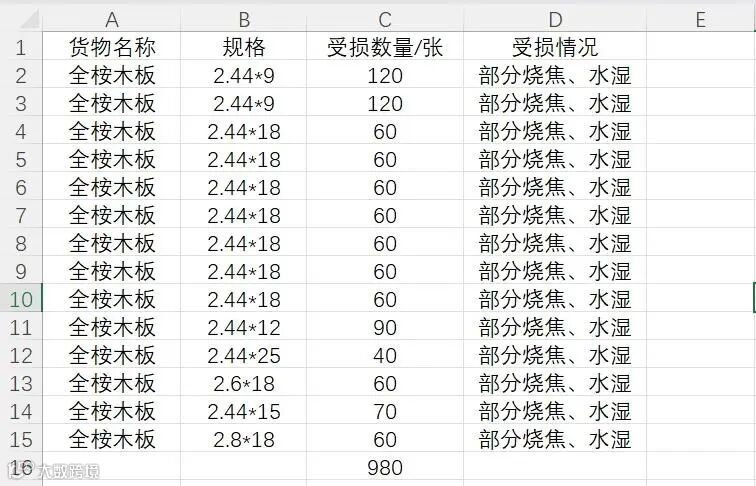 受损原因: 火灾