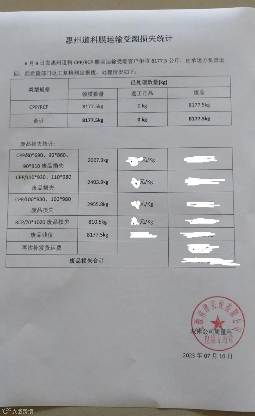 受损程度:纸管湿透