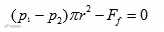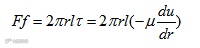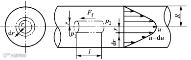 如上图所示,液体在直径d的圆管中作层流运动,圆管水平放置,在管内取一段与管轴线重合的小圆柱体,设其半径为r,长度为l。在这一小圆柱体上沿管轴方向的作用力有:左端压力p1,右端压力p2,圆柱面上的摩擦力为Ff。则其受力平衡方程式为: