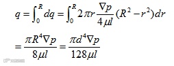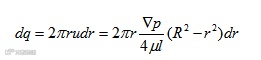 图(b)所示抛物体体积,是液体单位时间内流过通流截面的体积即流量。为计算其体积,可在半径为r处取一层厚度为dr的微小圆环面积,通过此环形面积的流量为:
