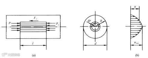 液体在直管中流动时的压力损失是由液体流动时的摩擦引起的,称之为沿程压力损失,它主要取决于管路的长度、内径、液体的流速和粘度等。液体的流态不同,沿程压力损失也不同。液体在圆管中层流流动在液压传动中最为常见,因此,在设计液压系统时,常希望管道中的液流保持层流流动的状态。