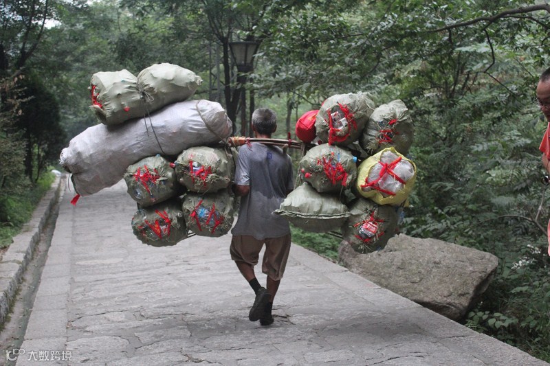 上图看看这个挑山工,虽然知道那些蛇皮袋里面都是空瓶子,但是这种架势也让爬山的我们佩服得五体投地日月无光七窍生烟。
