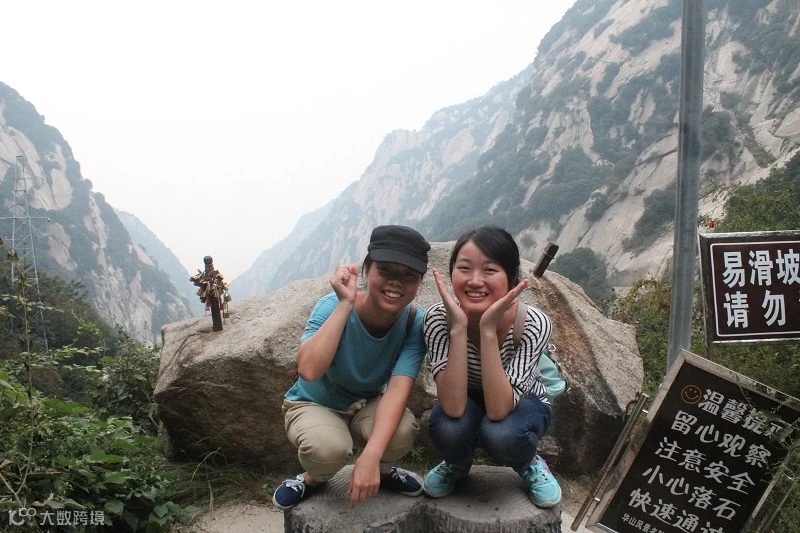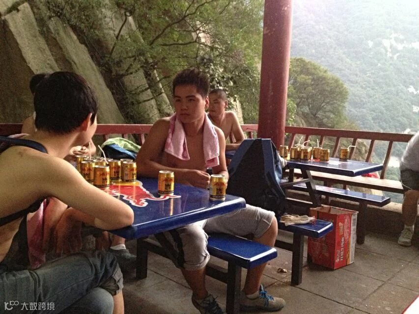 一路上,也开始认识其他人,有三个高中刚毕业的学生,从西安过来,两个是瘦瘦的帅小伙,一个是死胖子,跟我一样背着沉重的大包,我问他是不是来减肥的,他乐呵呵笑着。年轻真好,他们一开始就举动怪异,走五人宽的小路就开始蛇形前行,而且极快,我和友人语重心长的说:年轻人,还是要节省一下体力,听说到北峰至少要5个小时,路途长着呢。