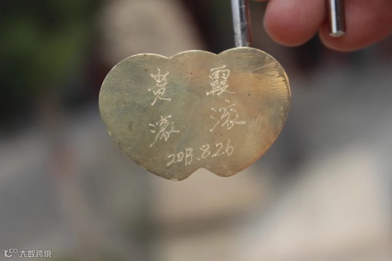 我们在山下补充了很多水,买了很多吃的,我算了一下,我的包里共背了8瓶水矿泉水,每瓶水4元钱,干粮若干,包里还有三个充电宝,衣物,水果,卷纸。傻逼逼的我竟然将自己的出差洗漱套餐都扔到里面去了,到了才想起来不知道怎地如此顺手甩进去的,据友人说,他当时看见也愣了一下,觉得我太特么爱干净了,都不好意思说我,心中暗骂,这些鬼东西也也带上,结果木有做声。艹,俩傻逼,一个糊里糊涂的乱扔,一个糊里糊涂的误以为人家有癖好。进玉泉院当口,各自到旁边的小店里买了同心锁,让店家刻上爱人和小孩的名字,我的是贵—霞,下边写着滚滚,呜哈哈。