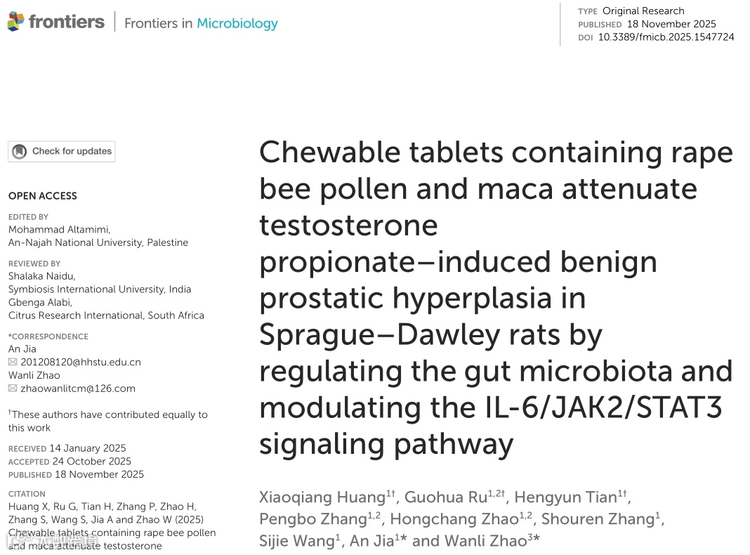 随着年龄增长,良性前列腺增生(BPH)已成为困扰许多中老年男性的常见健康问题。除了传统的药物治疗,科研人员正将目光投向天然、营养丰富的食品资源。近期,一项发表于《Frontiers in Microbiology》的研究,为我们揭示了油菜蜂花粉与玛咖联用,可能通过调节“肠道-前列腺轴”来缓解前列腺增生的新机制。