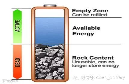 电池的能量存储可以分为三个虚拟区域,即可填充的空白区、提供能量的可用区以及由于使用和老化作用造成的闲置不可用区域,或者说是岩石区,如图1所示。