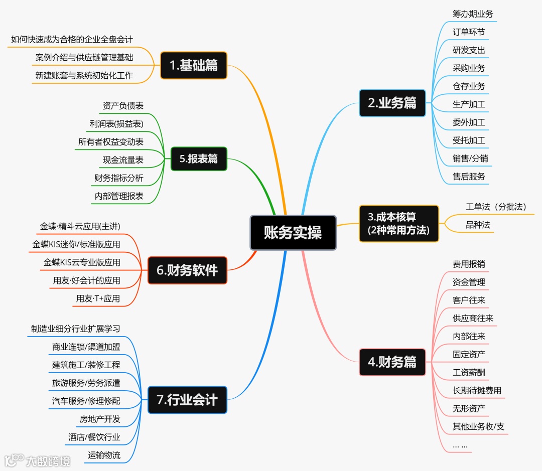 整个课程分为七大模块,分别是:基本篇、业务篇、财务篇、报表篇、财务软件和行业会计,非常清晰对吧。