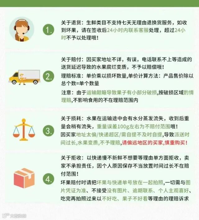 6、生鲜水果在运输过程中存在水分流失,所以每件净净重有+100g波动属于正常情况,敬请理解!不予售后。