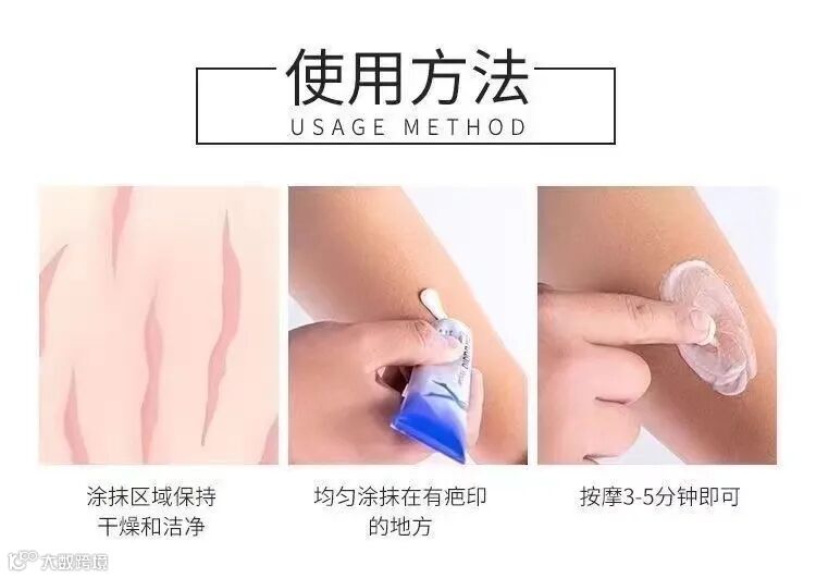 用法: 3个月以内的新疤使效果更显注!用使用前将伤痕清洗干净,每次将产品涂在患处,轻用力按摩2~3分钟,开始十天坚持3次 以后可以2-3次,睡前一定要1次✅