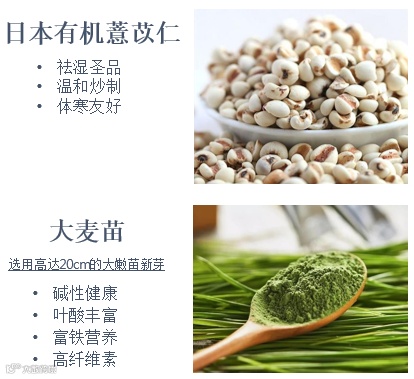 【产品功效】 ①祛湿排毒消除水肿;② 粉碎脂肪,预防静脉曲张;③提升精力,美容养肤;改善体寒体质 【产品成分】日本有机薏苡仁提取物、玉米须提取物、数十种高山果蔬精 华等。