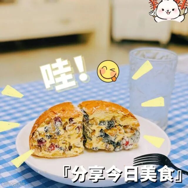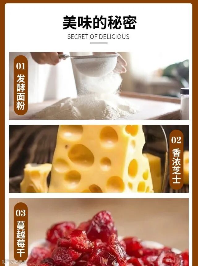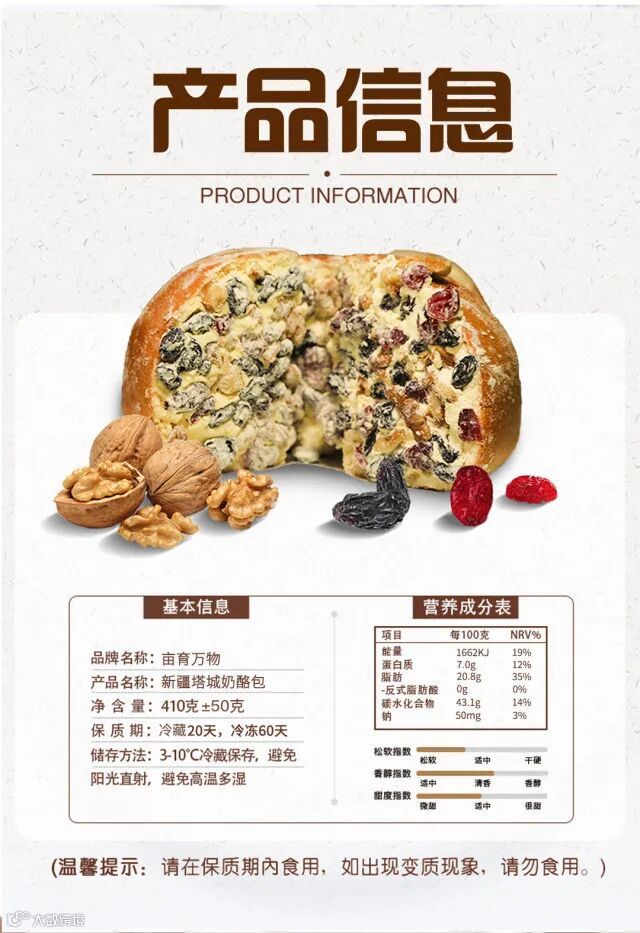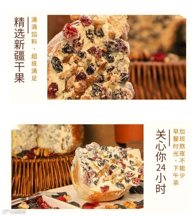 【配料表】:优质小麦粉,新鲜鸡蛋,纯牛奶,黄油,奶油,芝士,酵母粉,核桃仁,黑加仑,蔓越莓、木糖醇