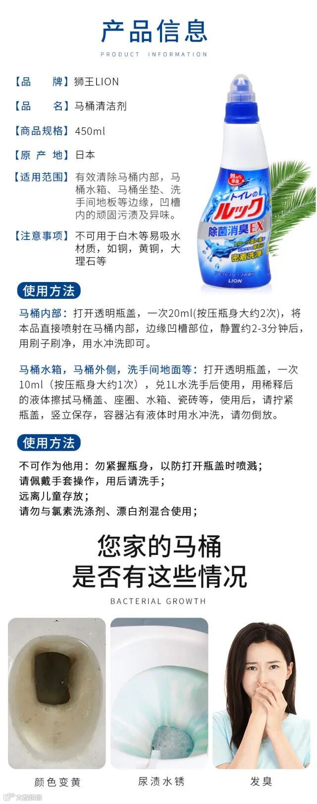 日本进口狮王LION马桶消臭尿垢去污清洁剂洁厕灵450ml*1瓶 原价:59元 粉丝群补贴价:26.5元