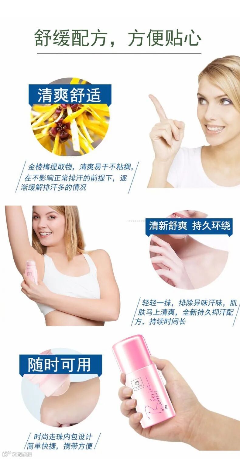 经常流汗出汗的男女都可以使用,清除异味止汗效果非常好。不刺激皮肤、不粘腻,而且很快干不会沾污衣物,轻轻涂抹于腋下肌肤,留下轻柔及百香的独特香味。外出携带也方便?身体乳,止汗露,一样的味道。