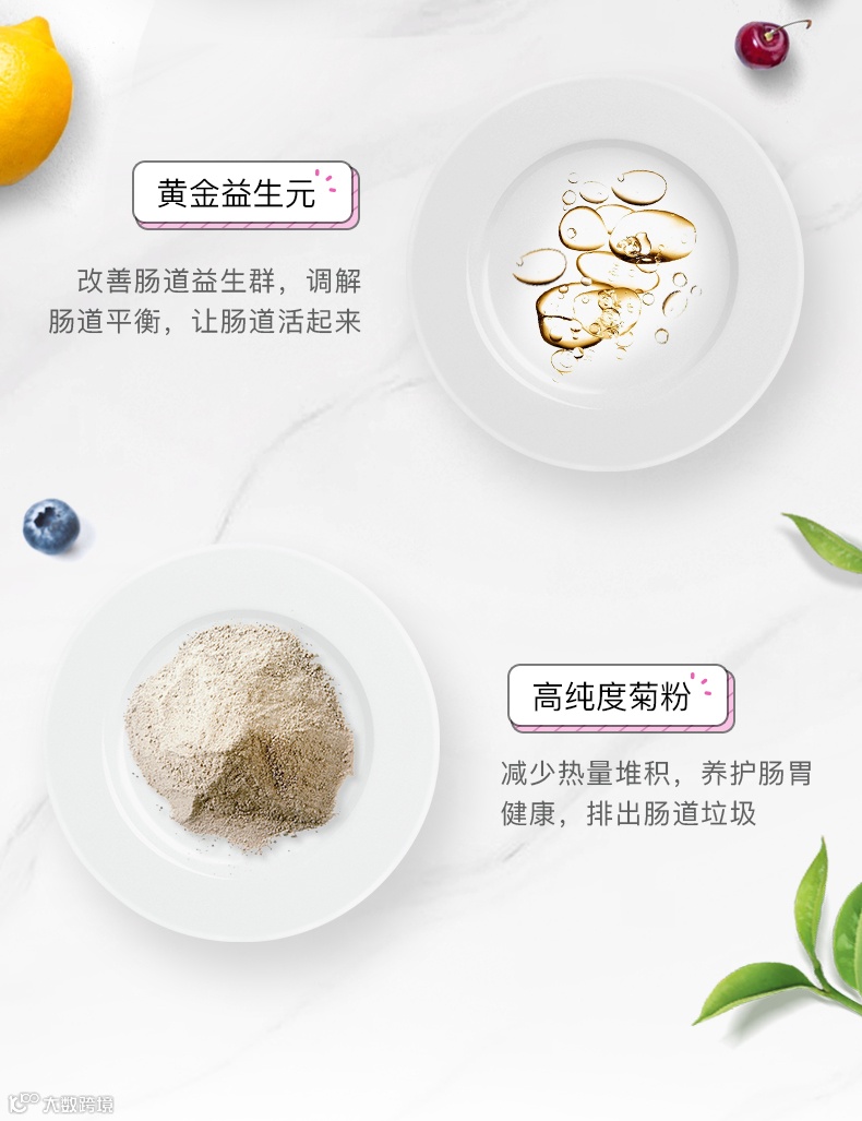 1) 复合发酵果蔬粉:浓缩98% 的果蔬精华 —— 加速代谢,排毒减脂,8大果蔬发酵,帮助肠道蠕动,排毒减脂