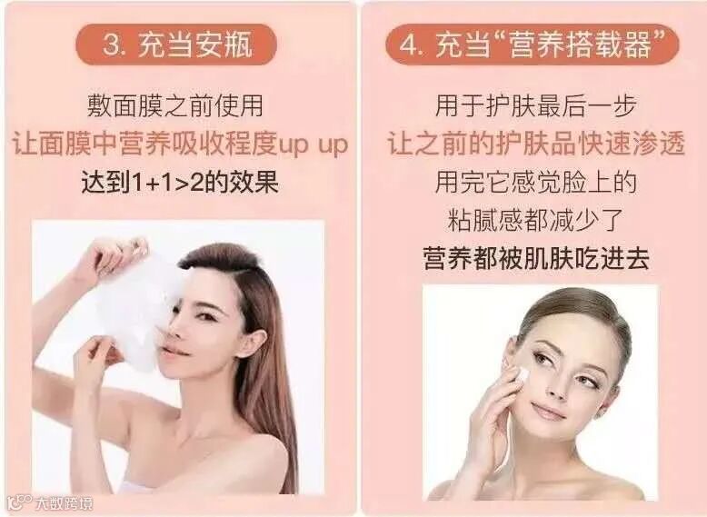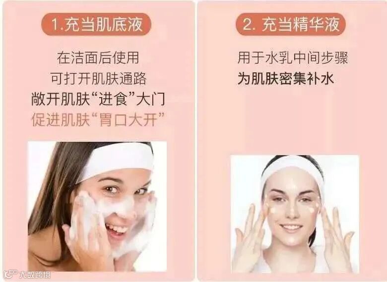 当爽肤水使用,用在洁面后。加倍渗透,促进后续产品更好吸收。