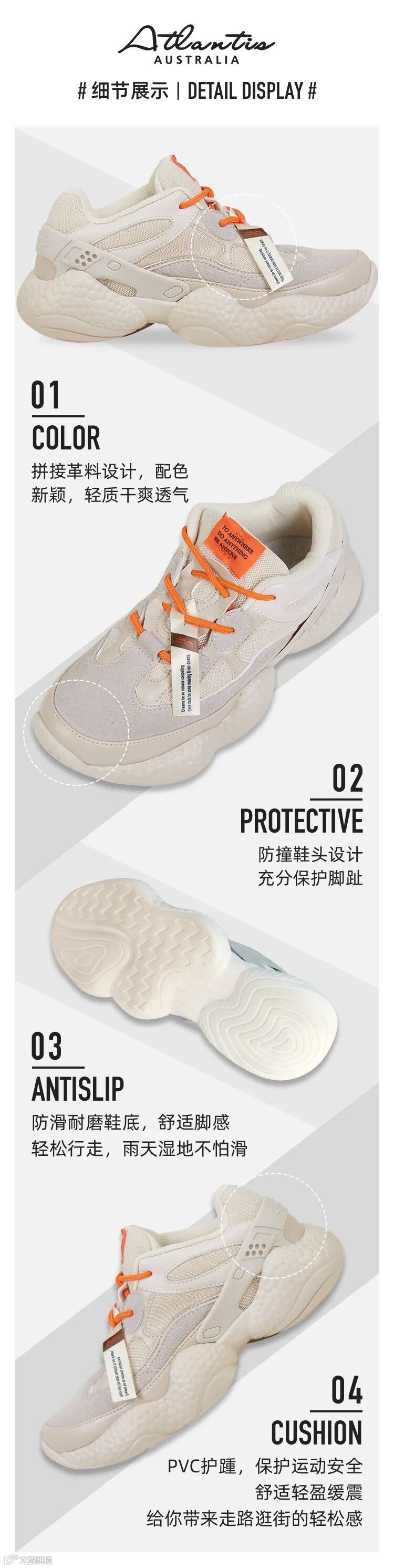 鞋面由反绒皮,超纤皮,透气网格布,PVC四种材料 相互拼接,