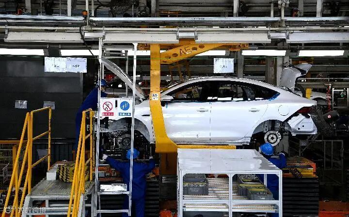 2022年4月20日,工作人员在西安比亚迪草堂工业园汽车总装厂进行新能源汽车装配。新华社记者 刘潇摄