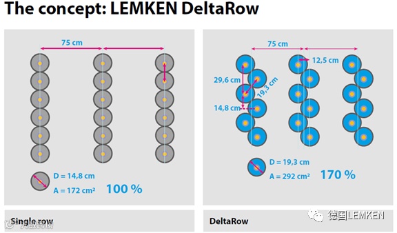 DeltaRow品字形播种是德国雷肯阿祖瑞特(LEMKENAzurit)精量播种机独有的一种播种排列方式。相比于传统的单行播种,使用DeltaRow品字形播种方式的德国雷肯Azurit(阿祖瑞特)精量播种机具有更高的壮苗率,更高的化肥利用率,更高的产量——2020年德国奥斯纳布吕克(Osnabruck)大学发表的一篇论文再次印证了这一说法。